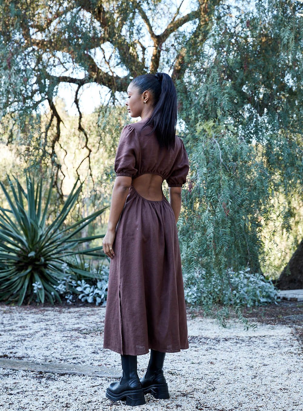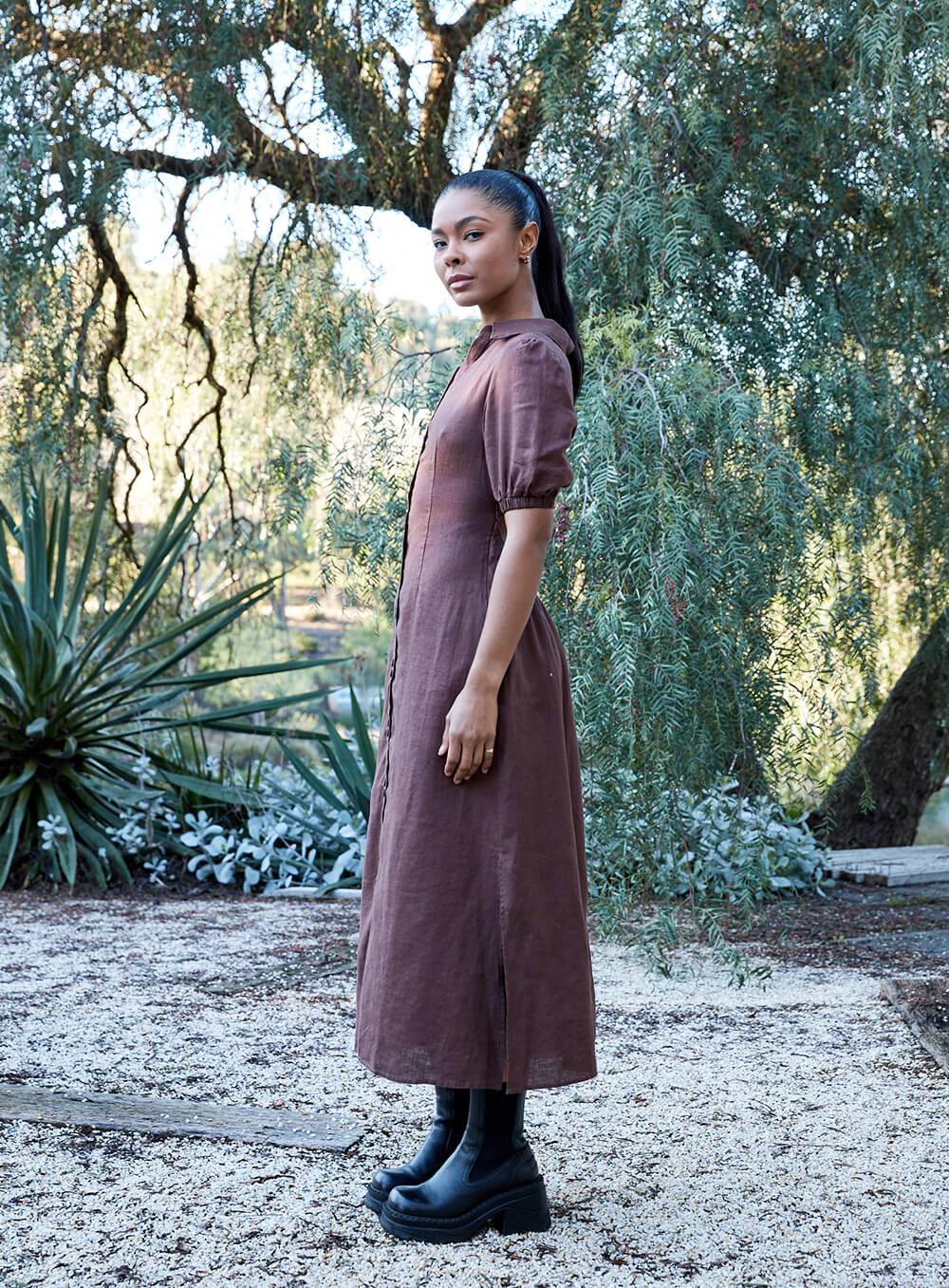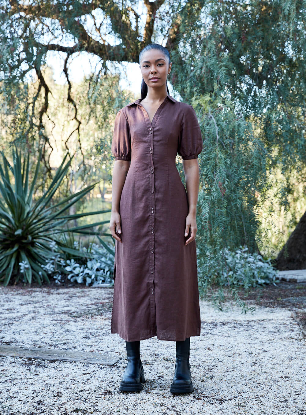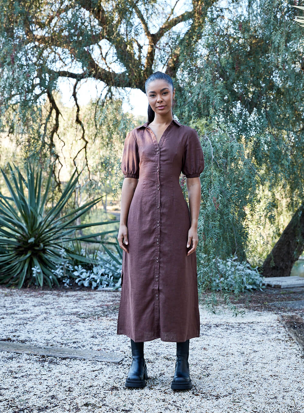 Created in premium 100% Linen. Button through. Elastic Sleeve. Model wears size 8-S-S/M