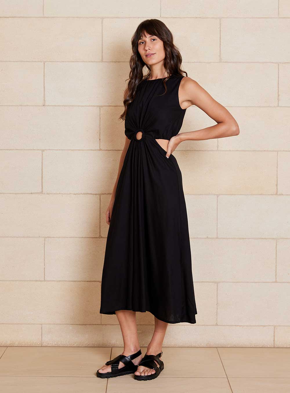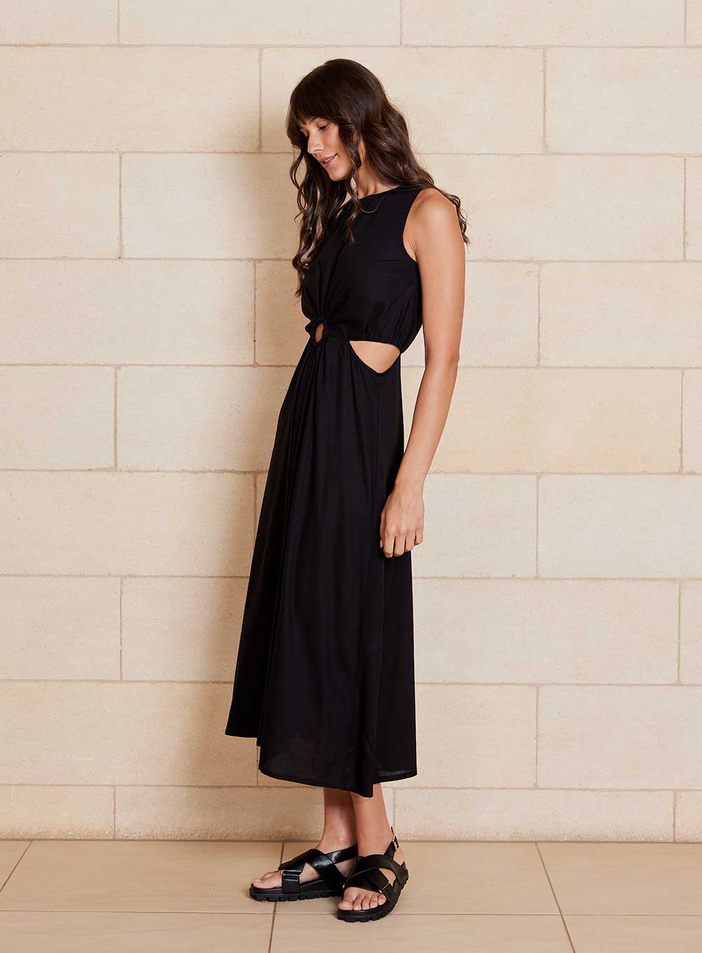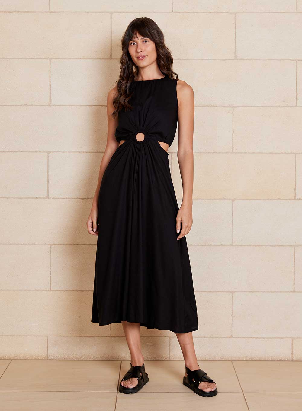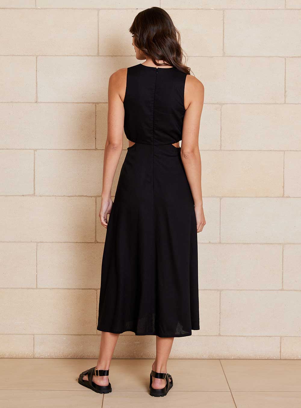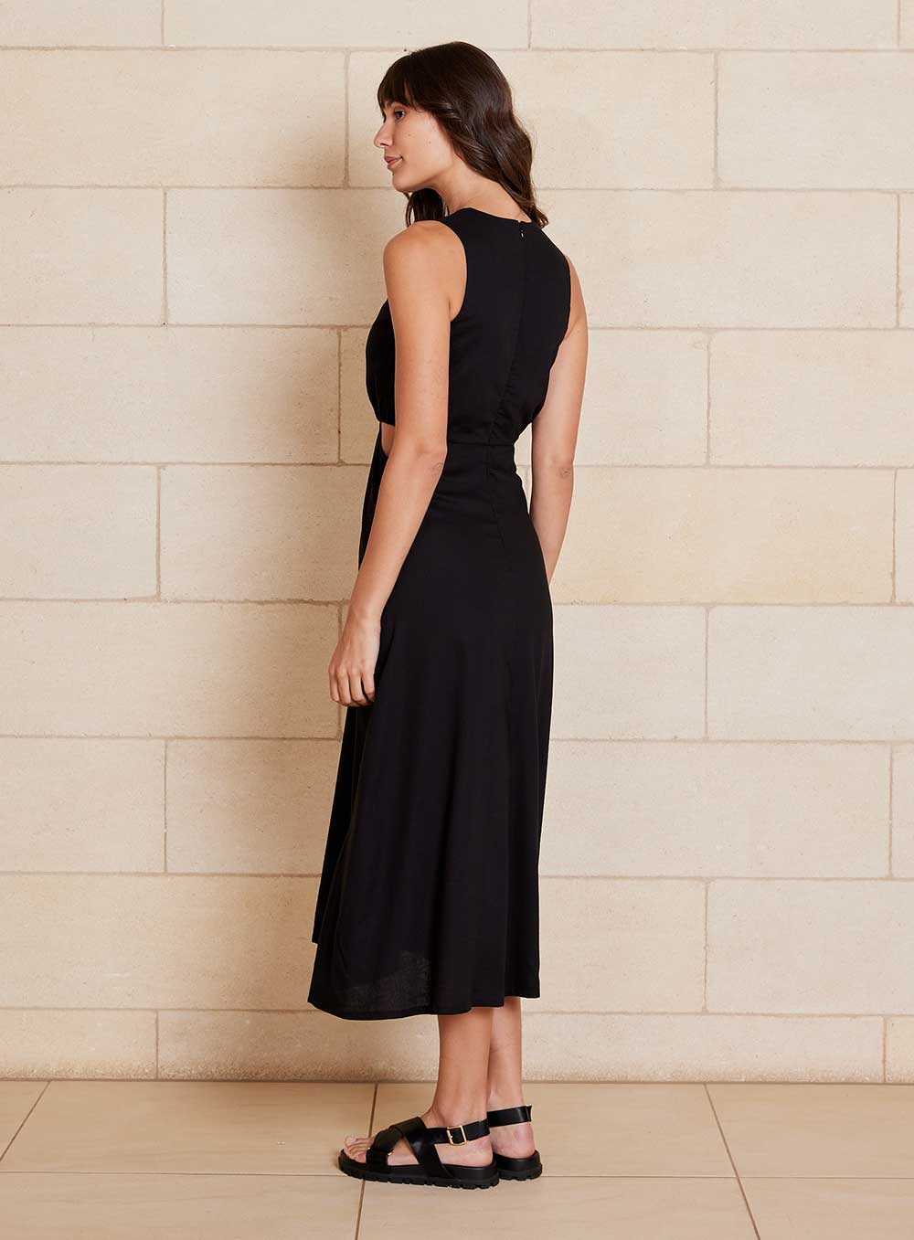 Midi Length Style created in premium 55% Linen & 45% Rayon blend. Invisible zip in back, Ring Circle at front and cutaway sides. Model wears size 8.