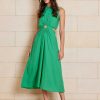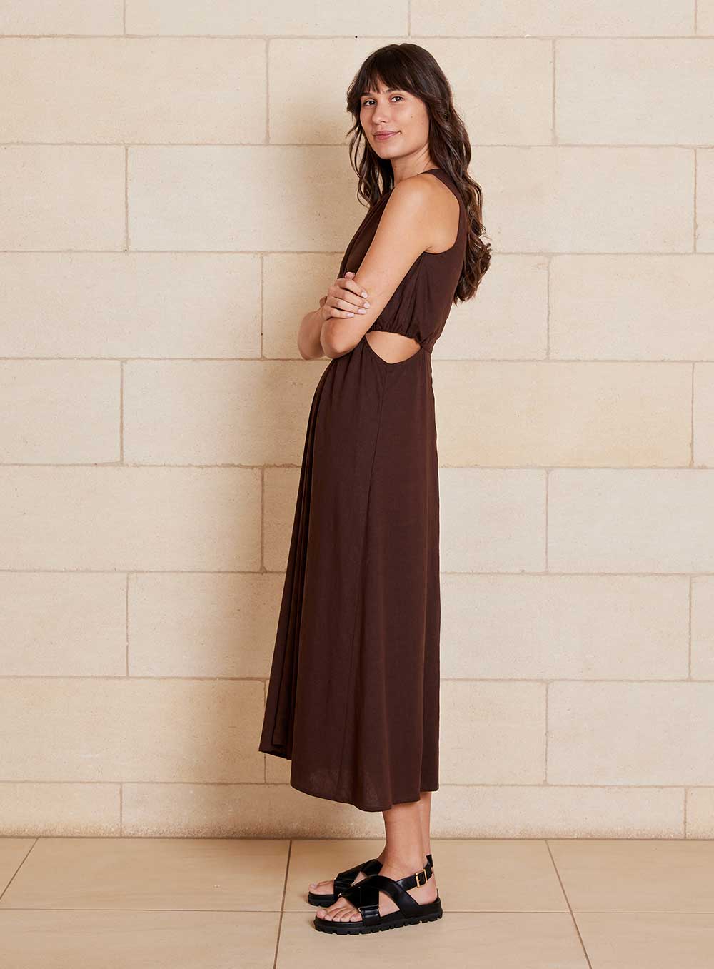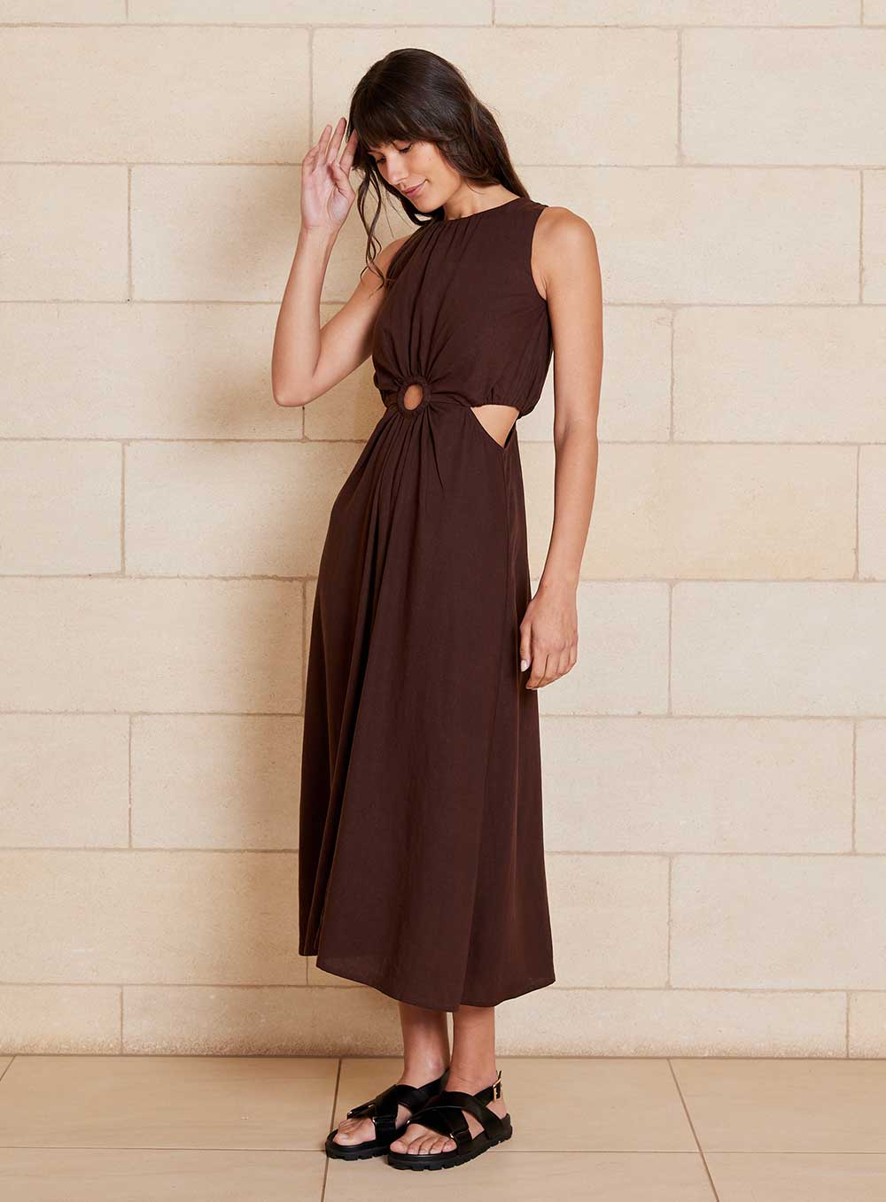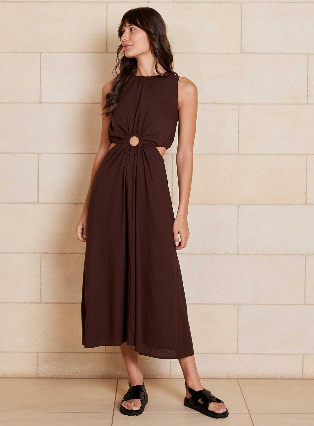 Midi Length Style created in premium 55% Linen & 45% Rayon blend. Invisible zip in back, Ring Circle at front and cutaway sides. Model wears size 8.