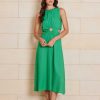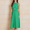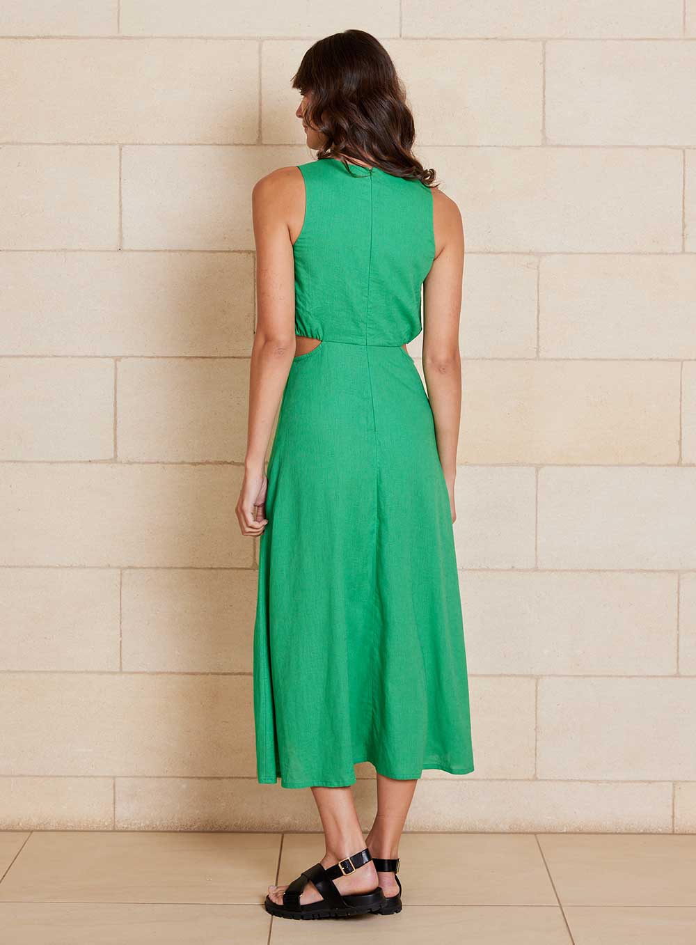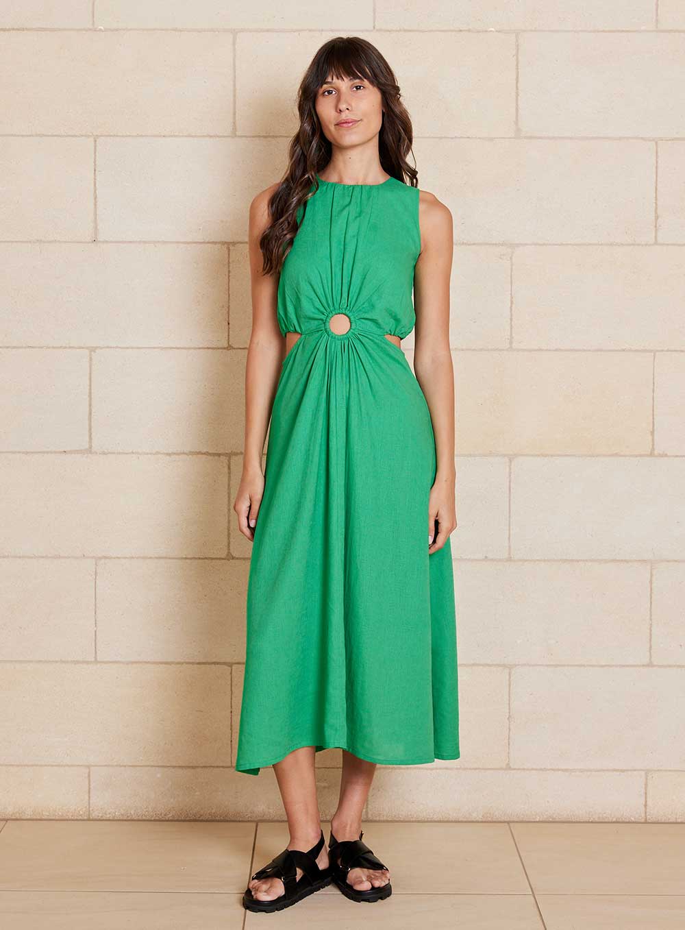 Midi Length Style created in premium 55% Linen & 45% Rayon blend. Invisible zip in back, Ring Circle at front and cutaway sides. Model wears size 8.
