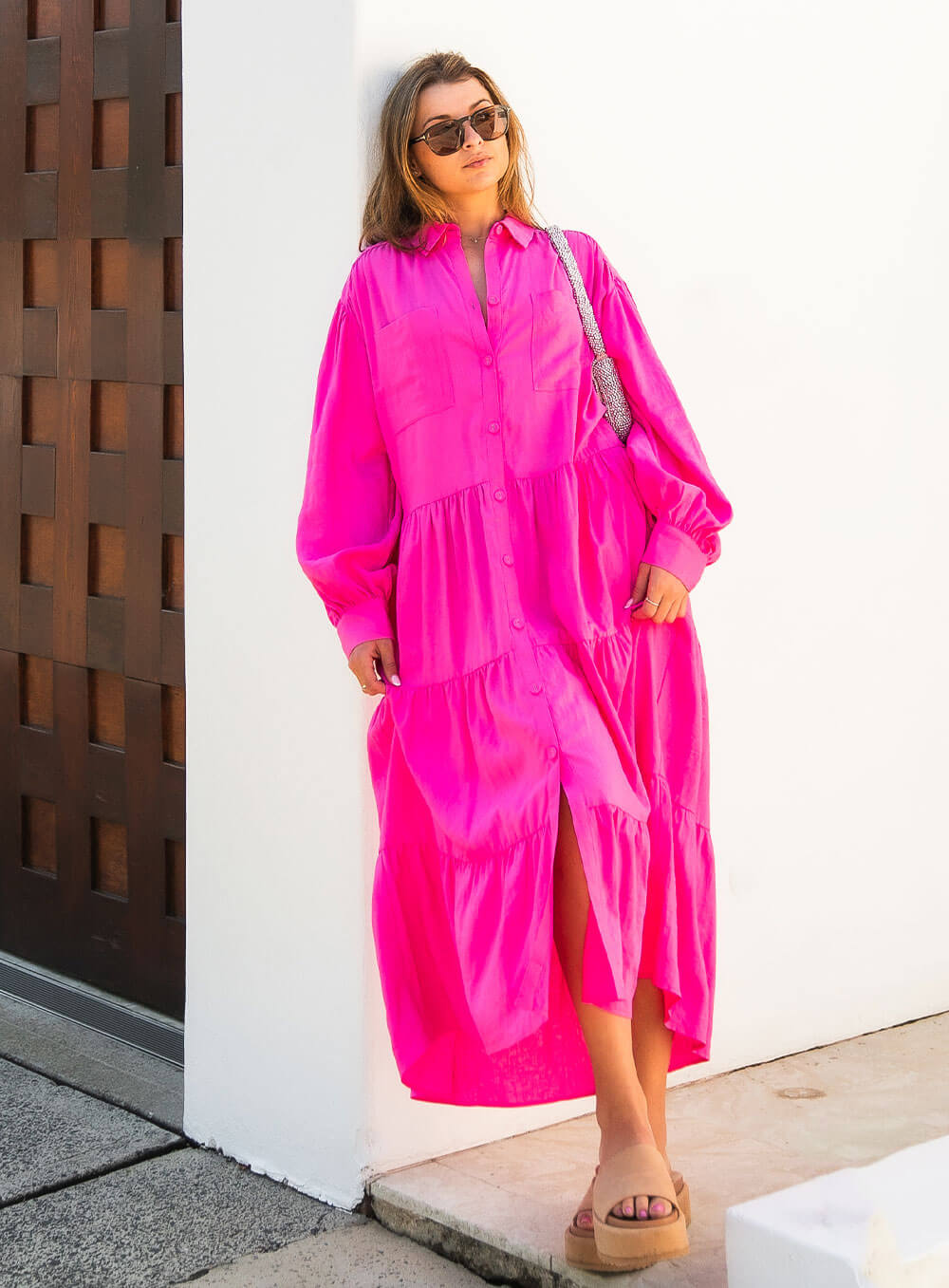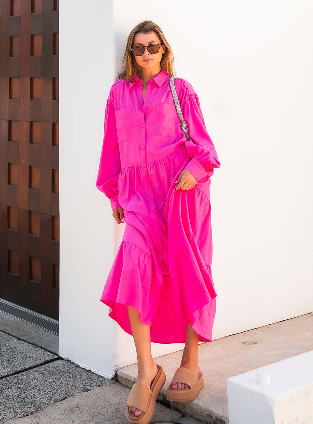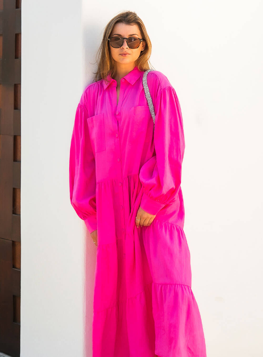 Designed with functionality in mind, this dress comes with conveniently placed pockets at the hips and additional pockets on the chest. These pockets not only enhance the dress’s practicality by offering storage for small essentials but also add an element of functionality to the overall design.