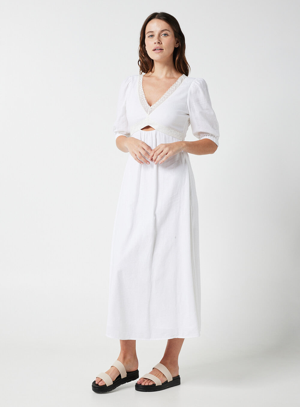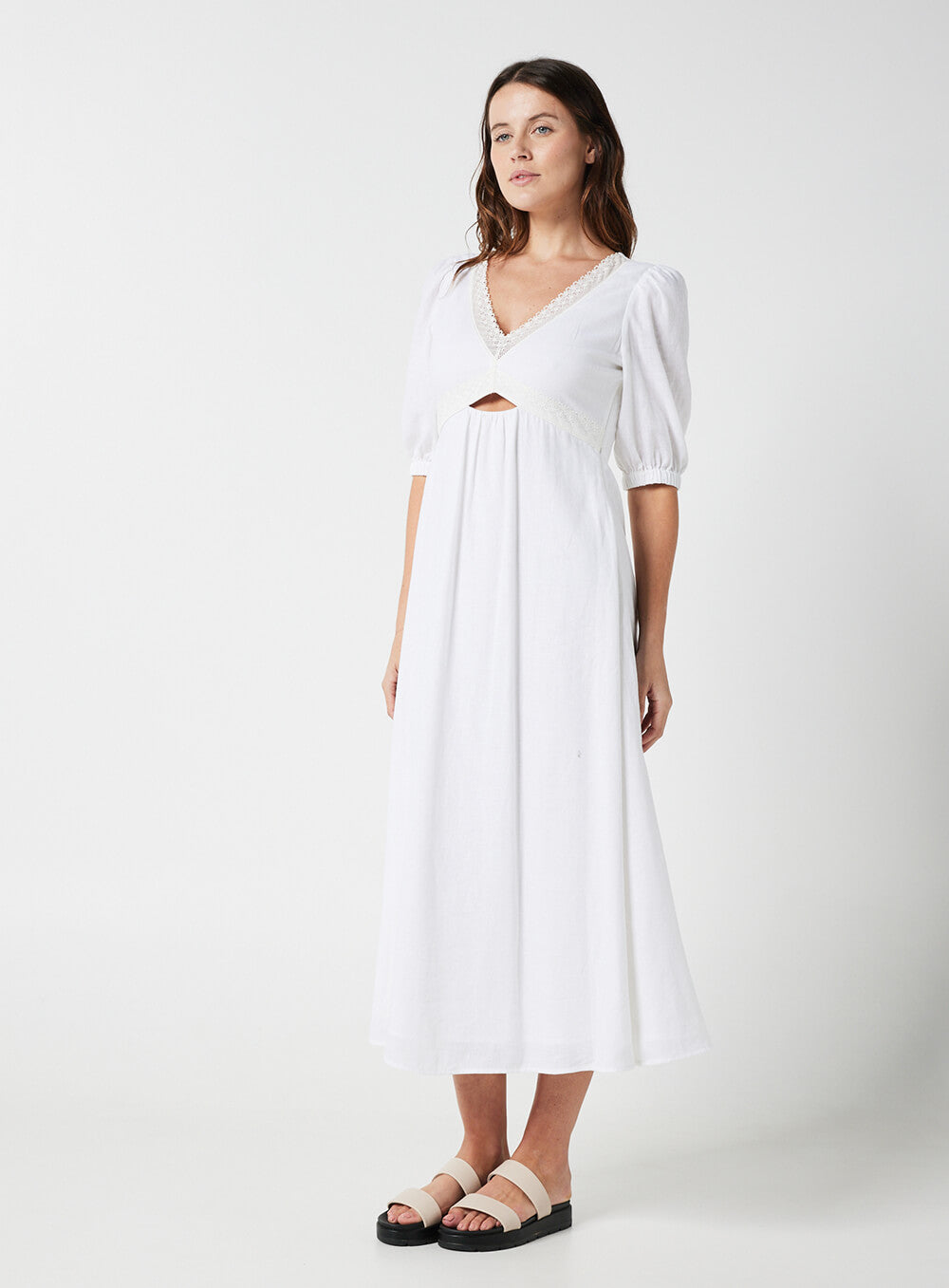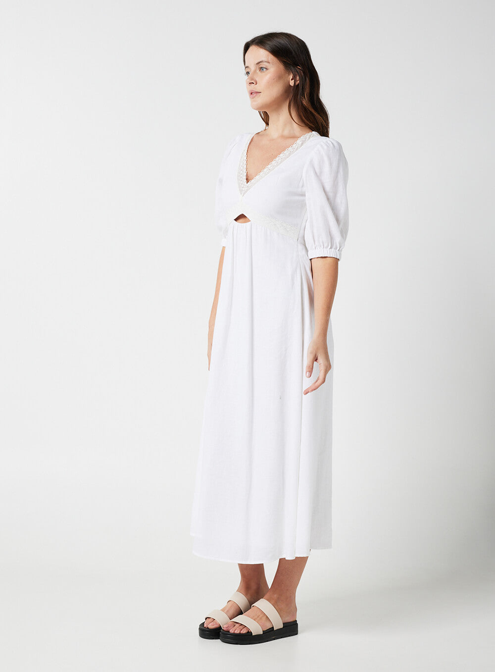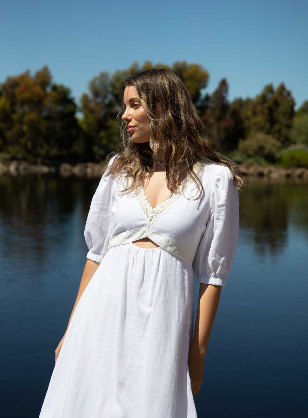 This garment is made from a premium 55% Linen & 45% Rayon blend, detailed with cotton based lace. Our model wears a size AU 8/S.