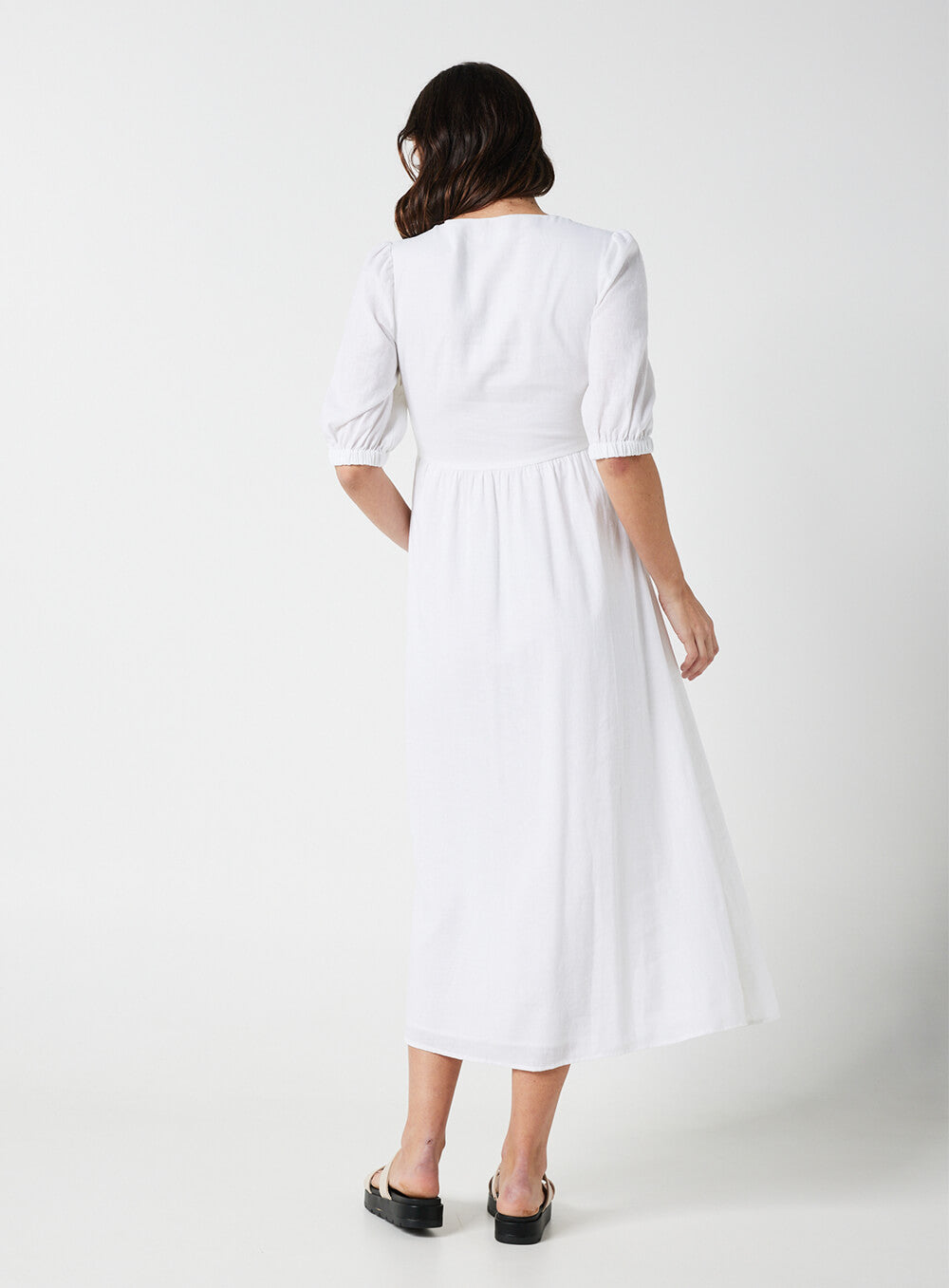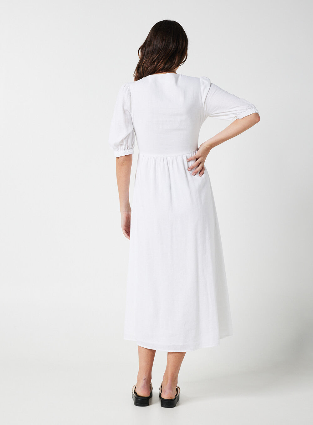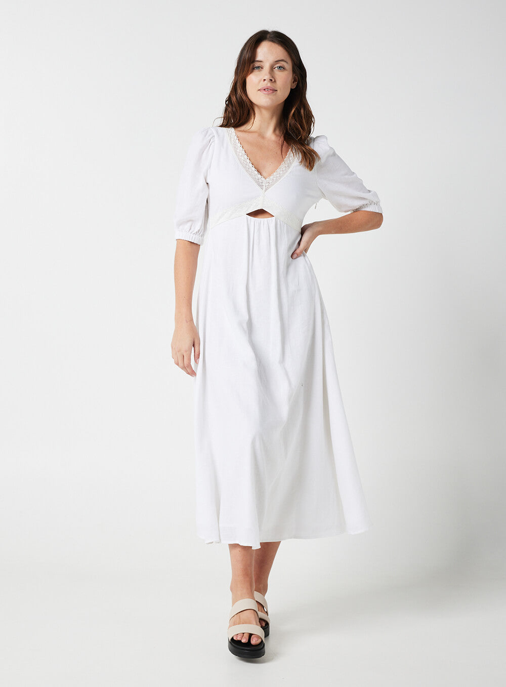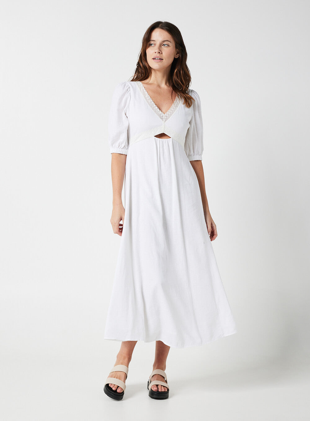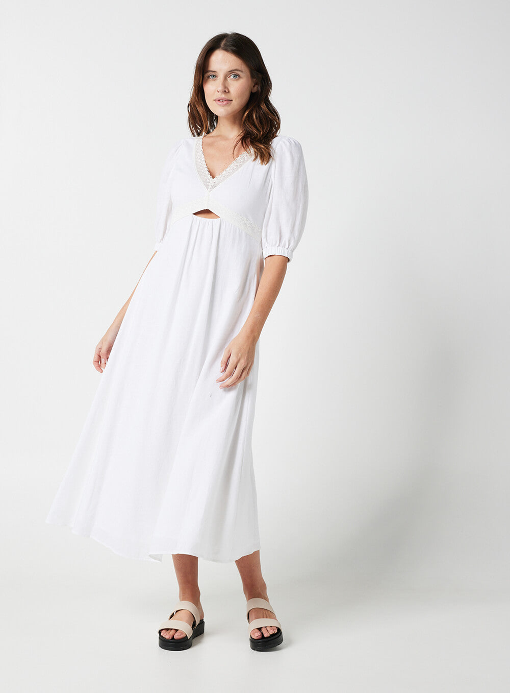 This garment is made from a premium 55% Linen & 45% Rayon blend, detailed with cotton based lace. Our model wears a size AU 8/S.