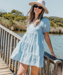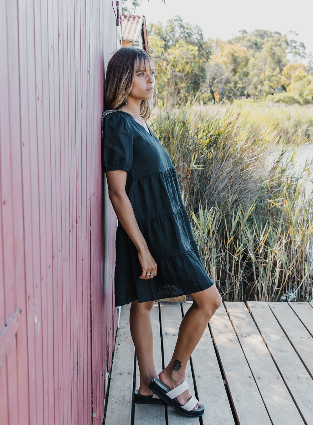 Tiered Babydoll Style created in luxe 55% Linen & 45% Rayon. V Neck. Short sleeve with slight fullness. Model wears size 8.