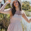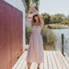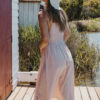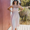 Latte toned soft Cotton/Poly blend. Shirred Bust. Functional ties at shoulder. Midi length. Model wears size 8.