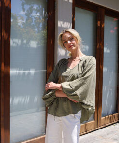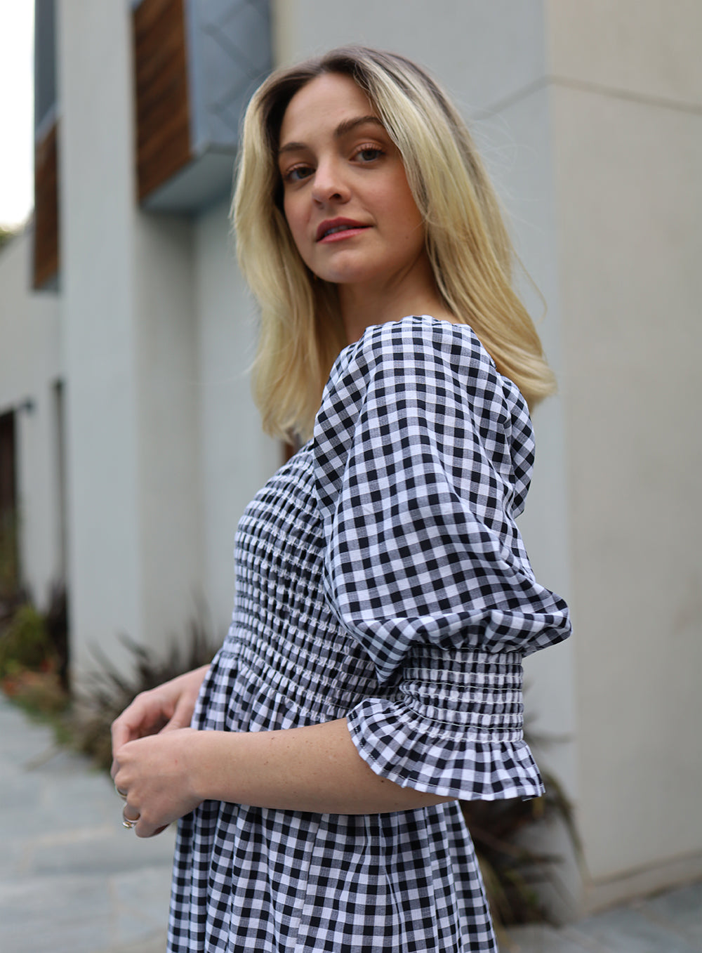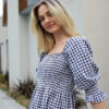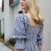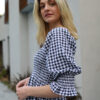Ruched Elasticised Bust. Sleeves can be worn up or down. Frill hem. Model wears size 8.