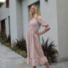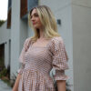 Ruched Elasticised Bust. Sleeves can be worn up or down. Frill hem. Model wears size 8.