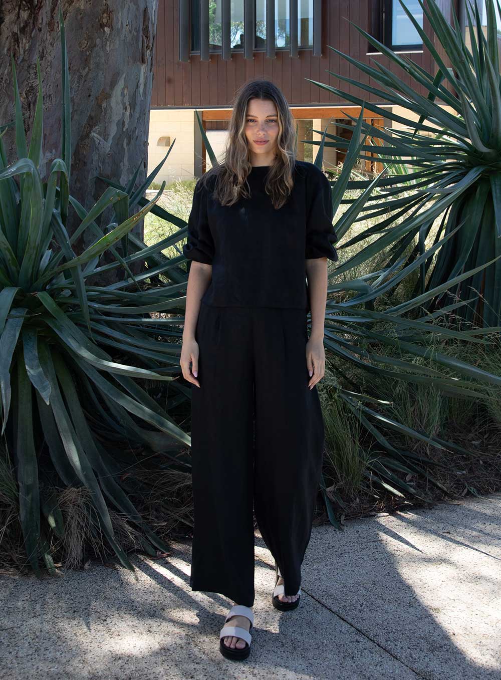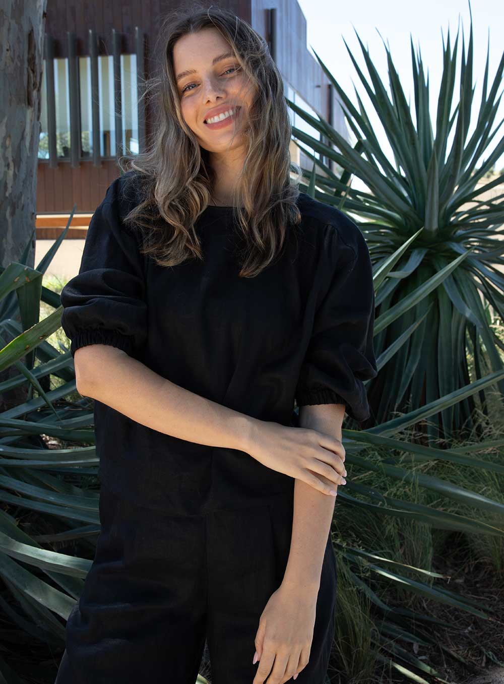 This garment is made from 100% washed linen. Our model wears a size AU 8/S.