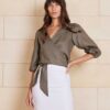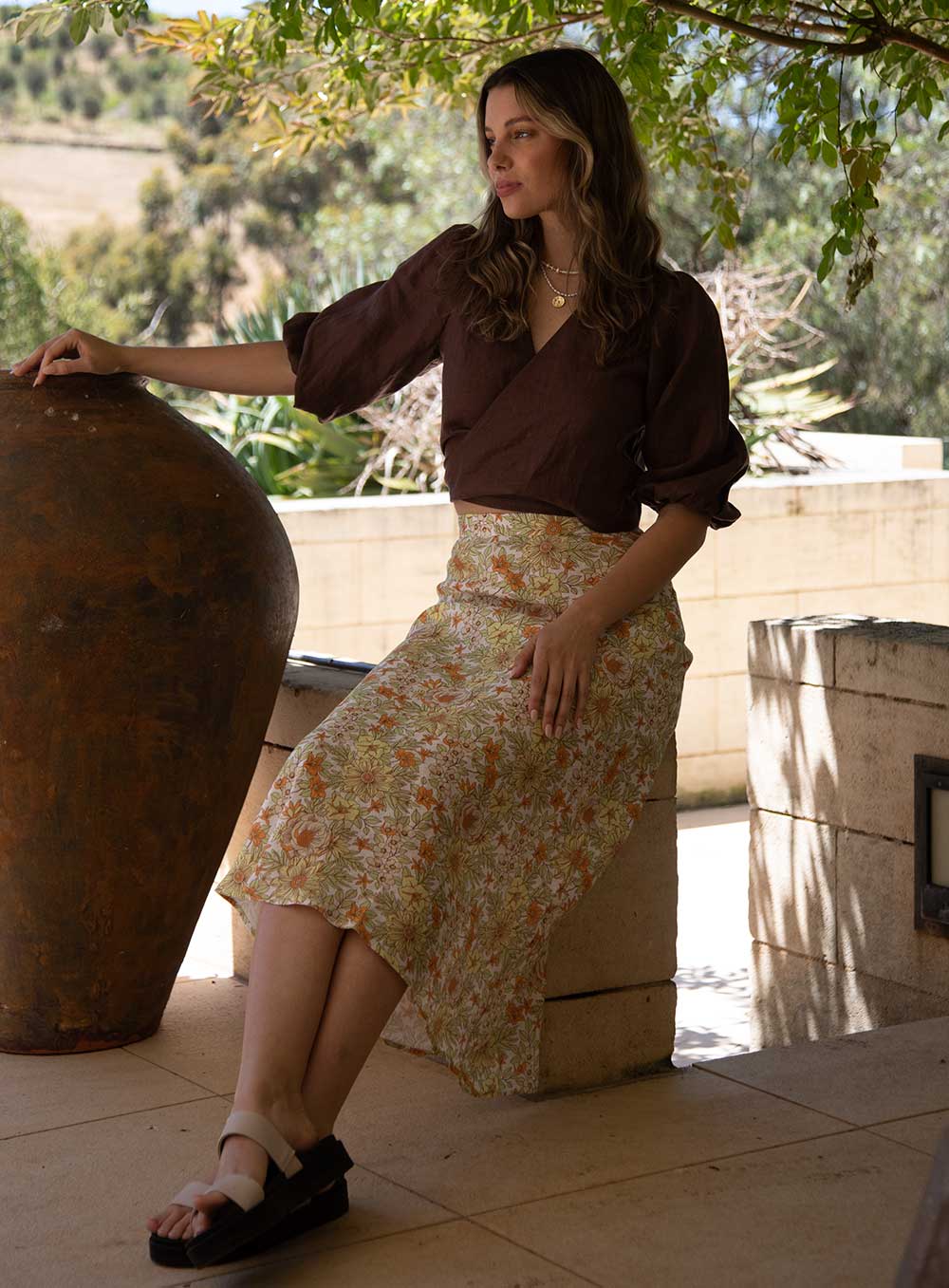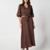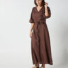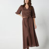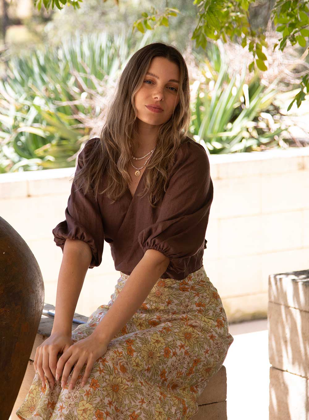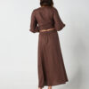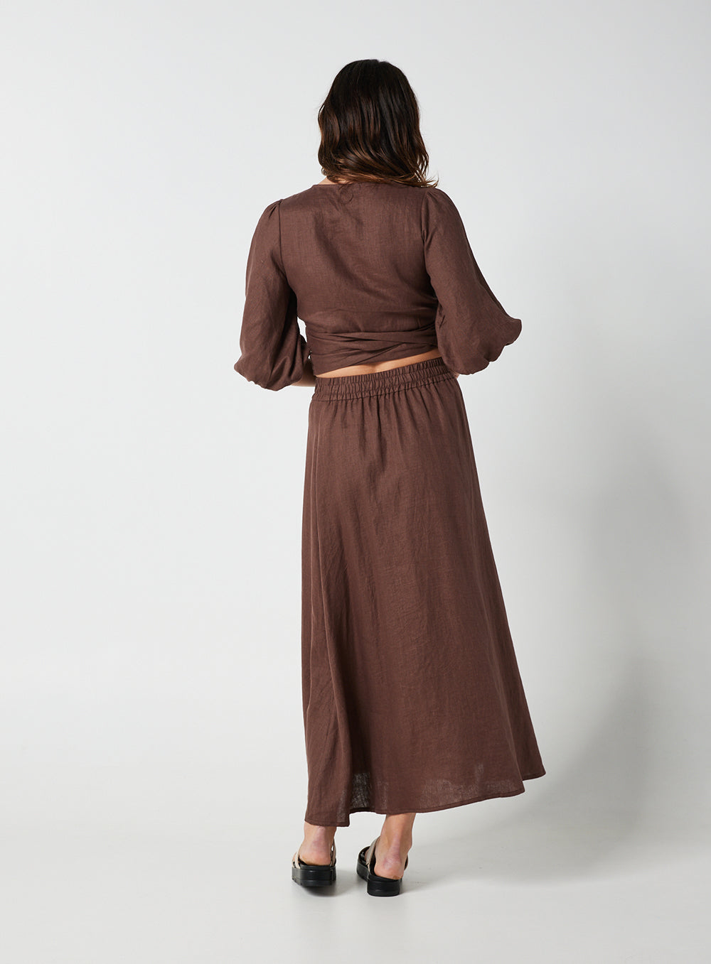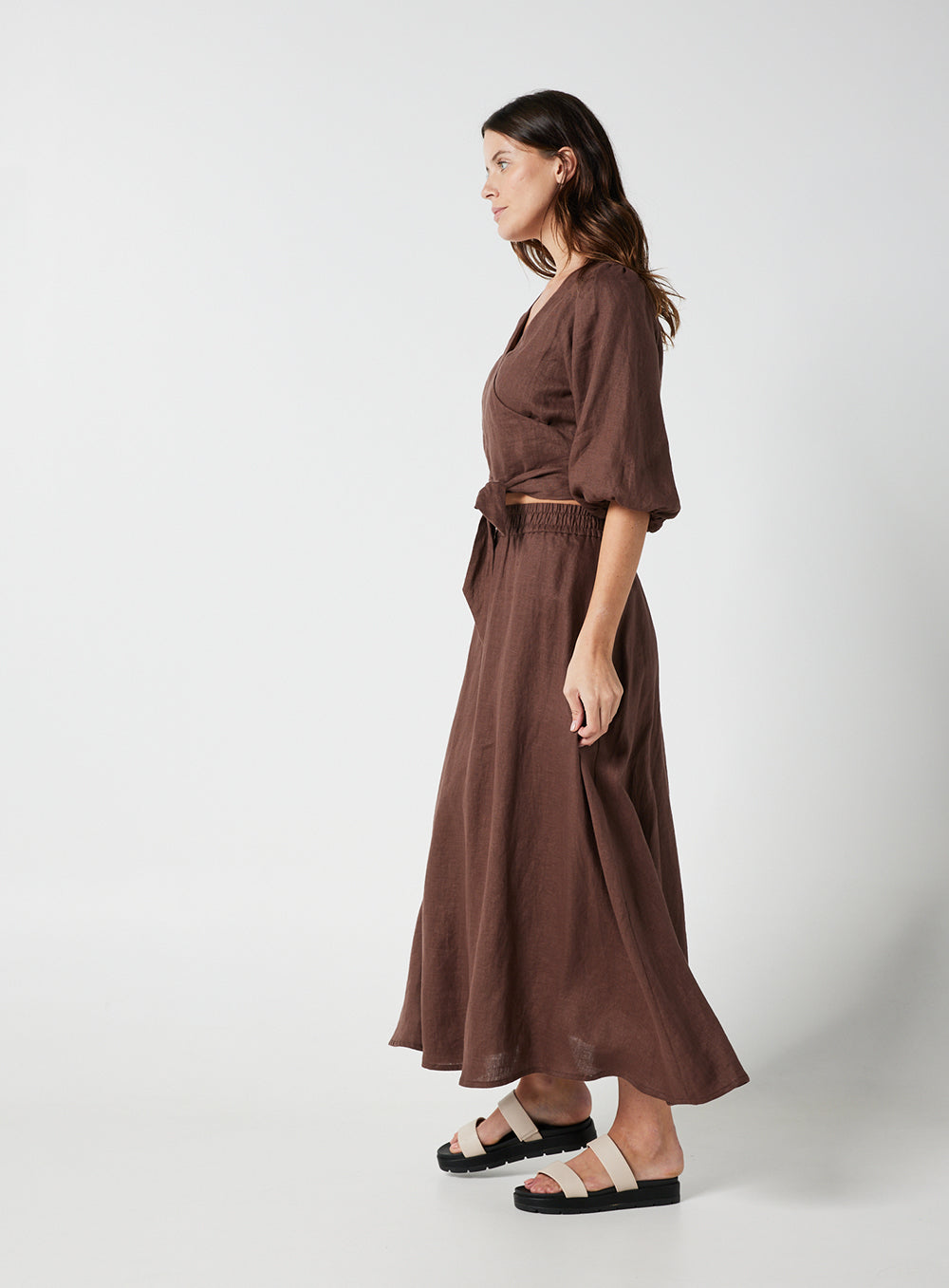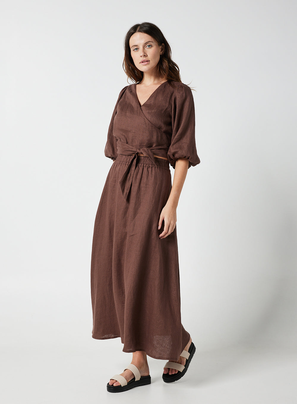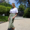 This garment is made from 100% washed linen. Our model wears a size AU 8/S.