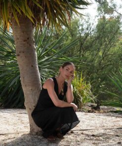 This garment is made from 100% washed linen. Our model wears a size AU 8/S.
