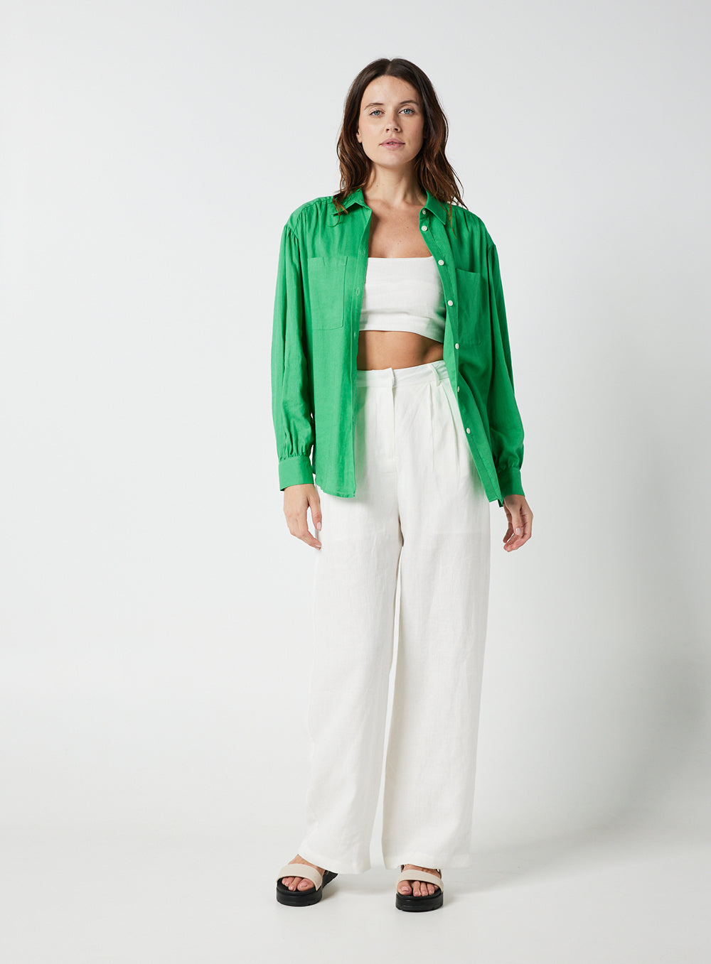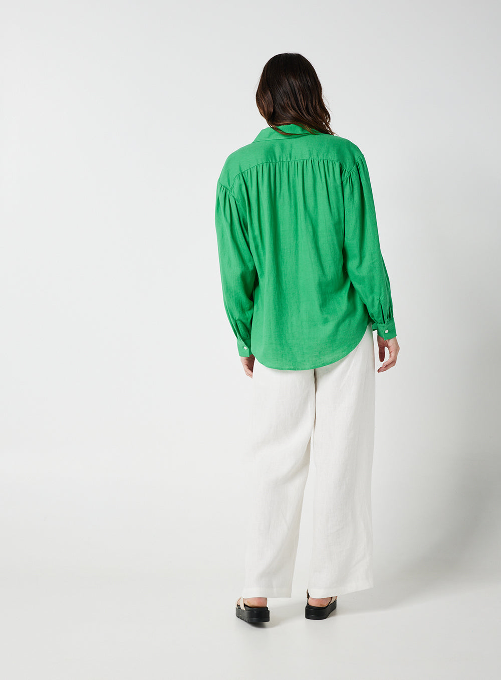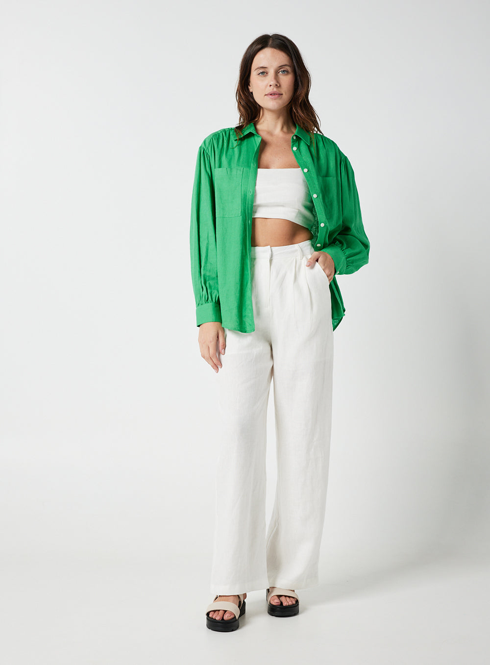 This garment is made from a luxe washed 55% Linen, 45% Viscose blend. Our model wears a size AU 8/S.
