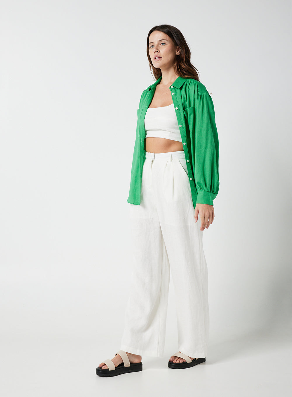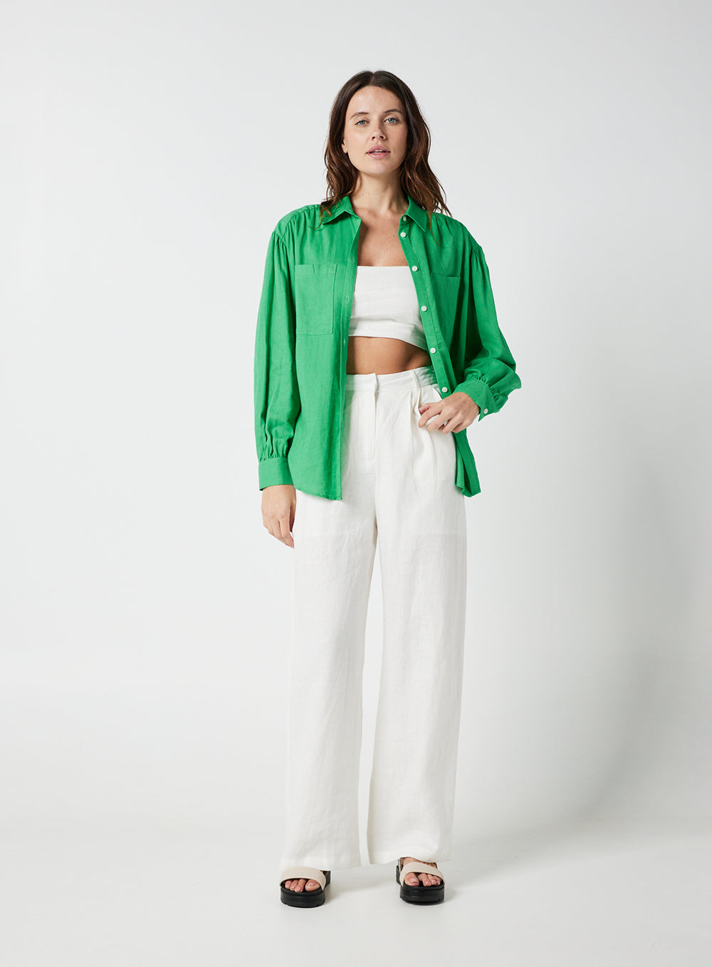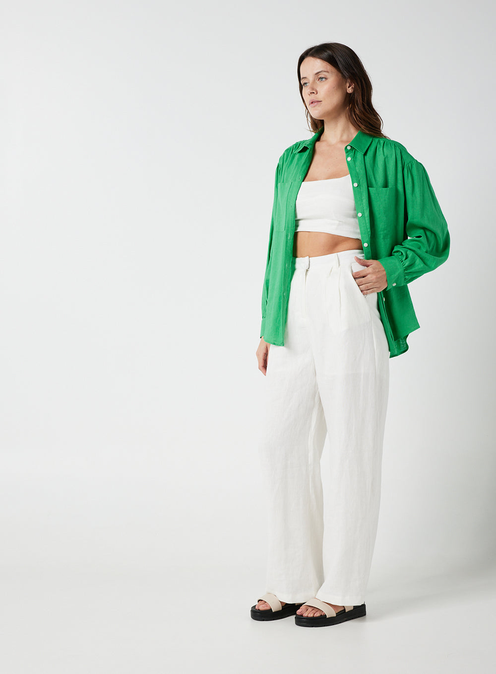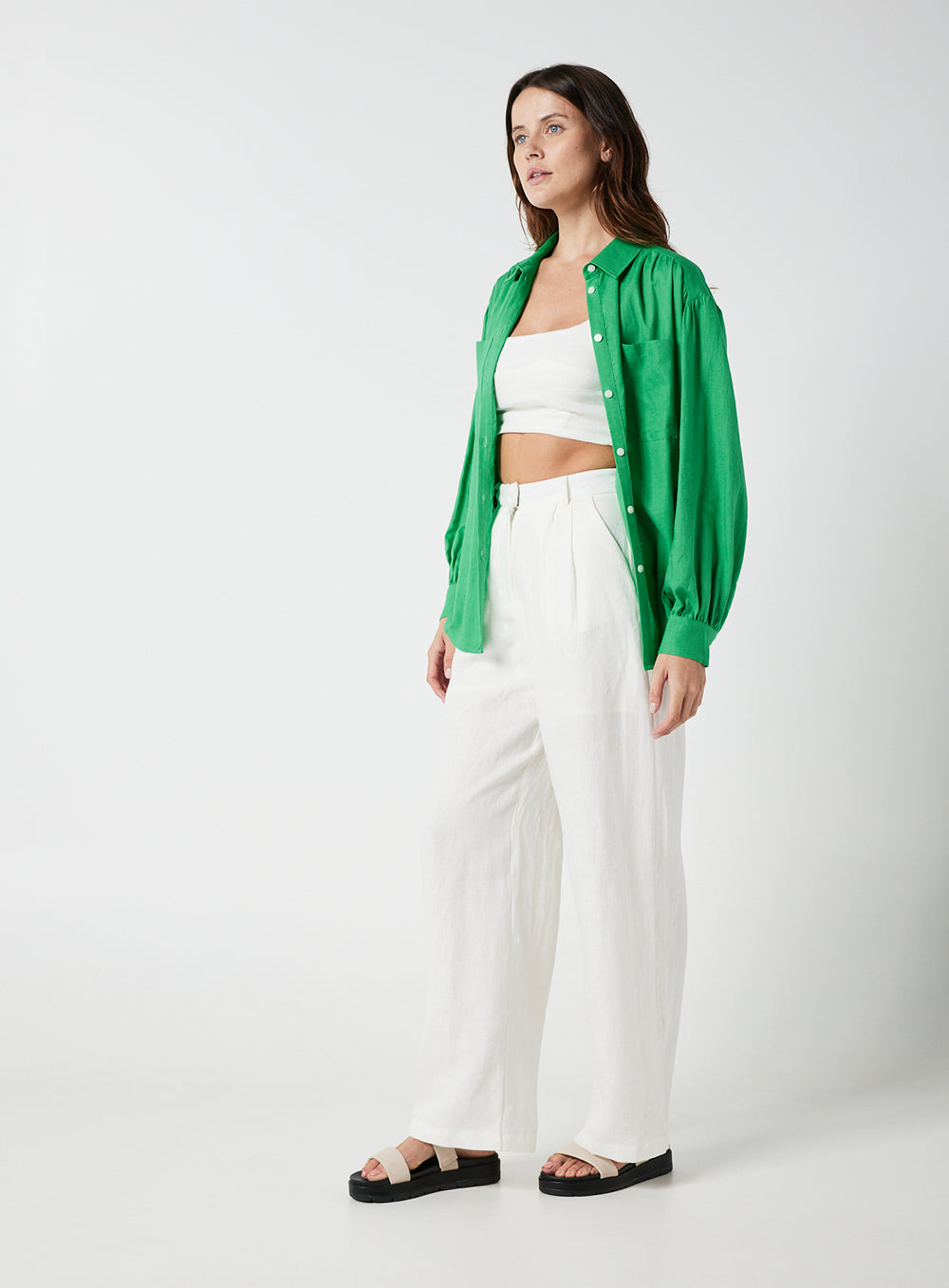This garment is made from a luxe washed 55% Linen, 45% Viscose blend. Our model wears a size AU 8/S.