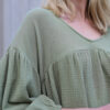 Loose/Full Fit. Ruched bust line and sleeve. Elastic Cuff.