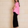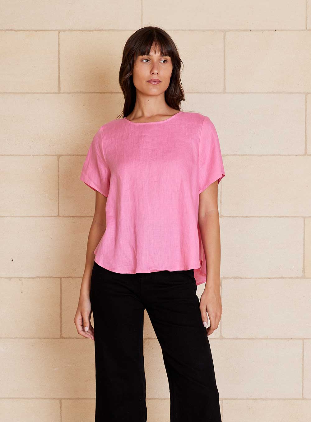 Round neckline, Loose fit. 100% soft feel linen. Button detail on back. Model wears size 8.