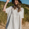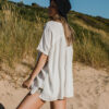 Oversized fit. Pocket at front. Round neckline. Roll sleeve. Created in soft and natural 55% Linen, 45% Rayon blend. Model wears size 8.