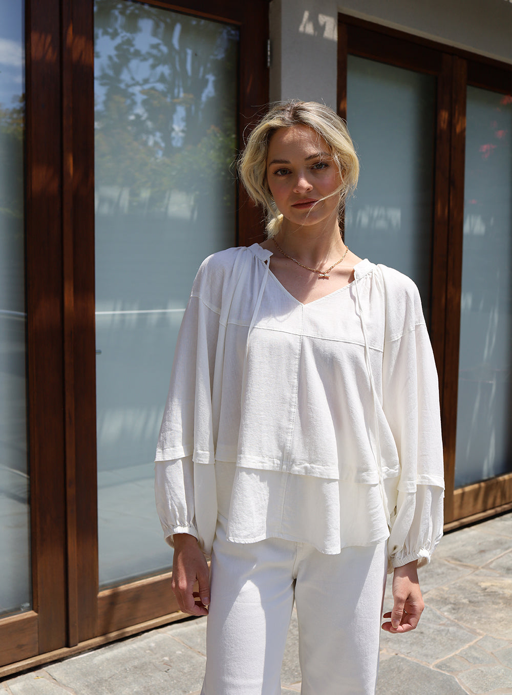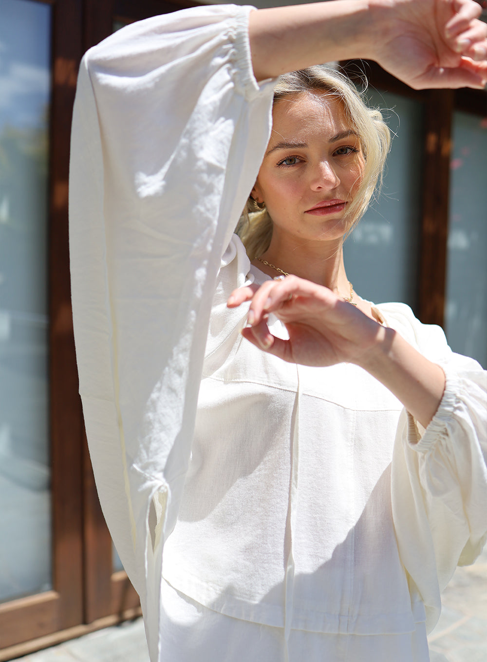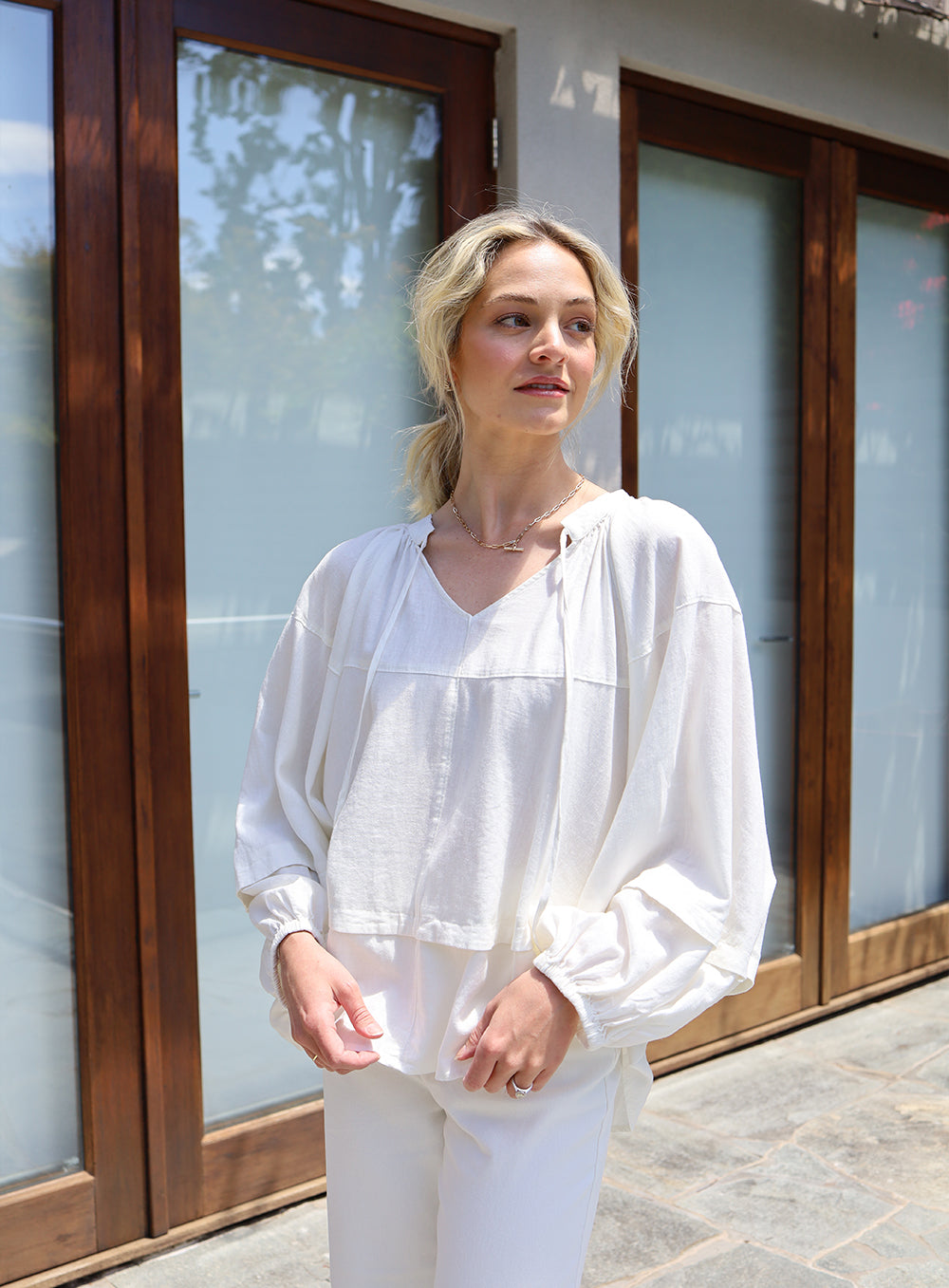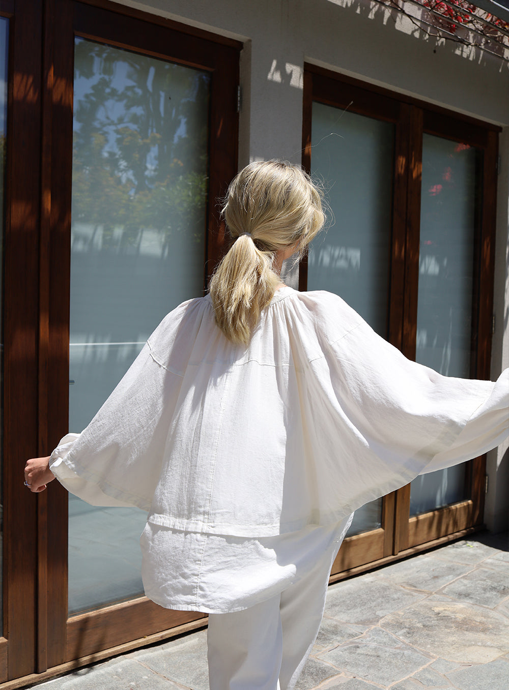 Batwing Sleeve. Loose fit. Ties at neck. Fabricated in a luxe 55% Linen, 45% Rayon blend.