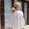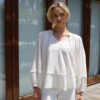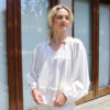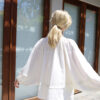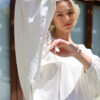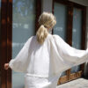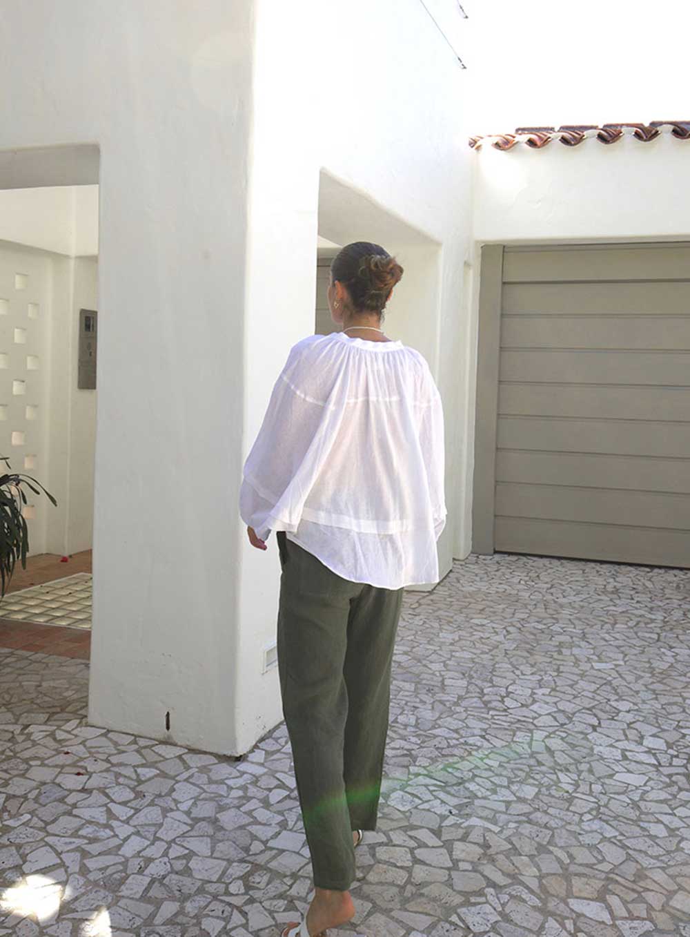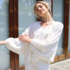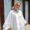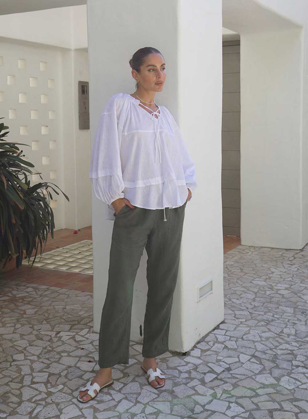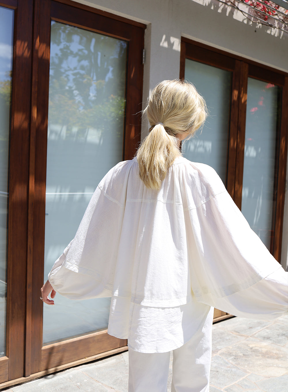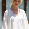 Batwing Sleeve. Loose fit. Ties at neck. Fabricated in a luxe 55% Linen, 45% Rayon blend.