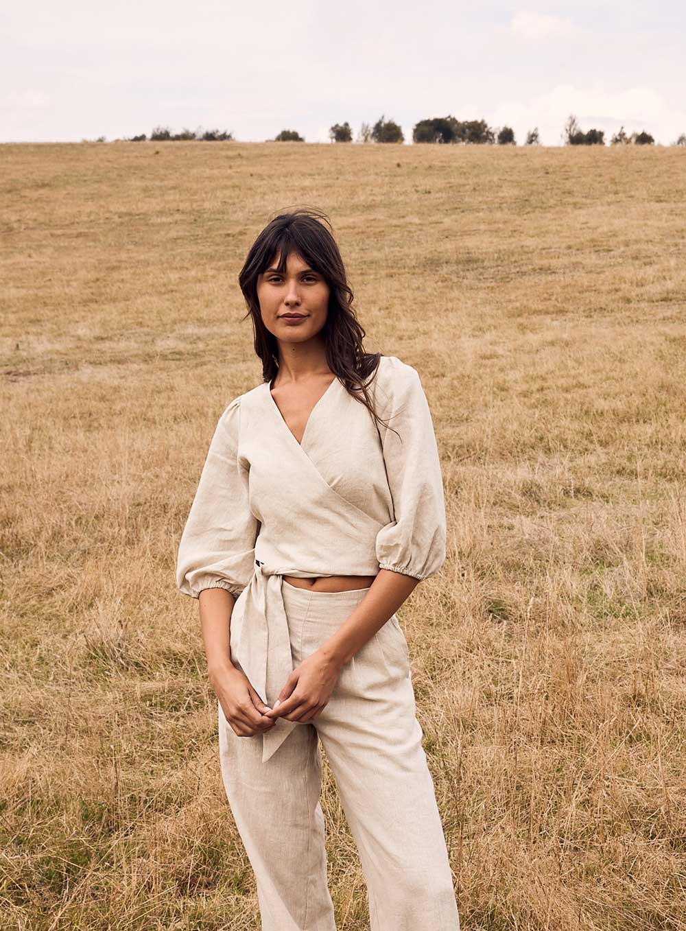 This garment is made from 100% washed linen. Our model wears a size AU 8/S.