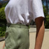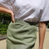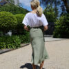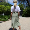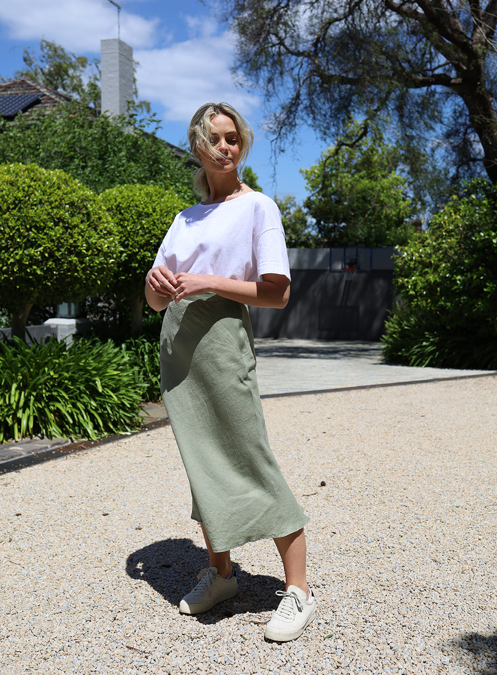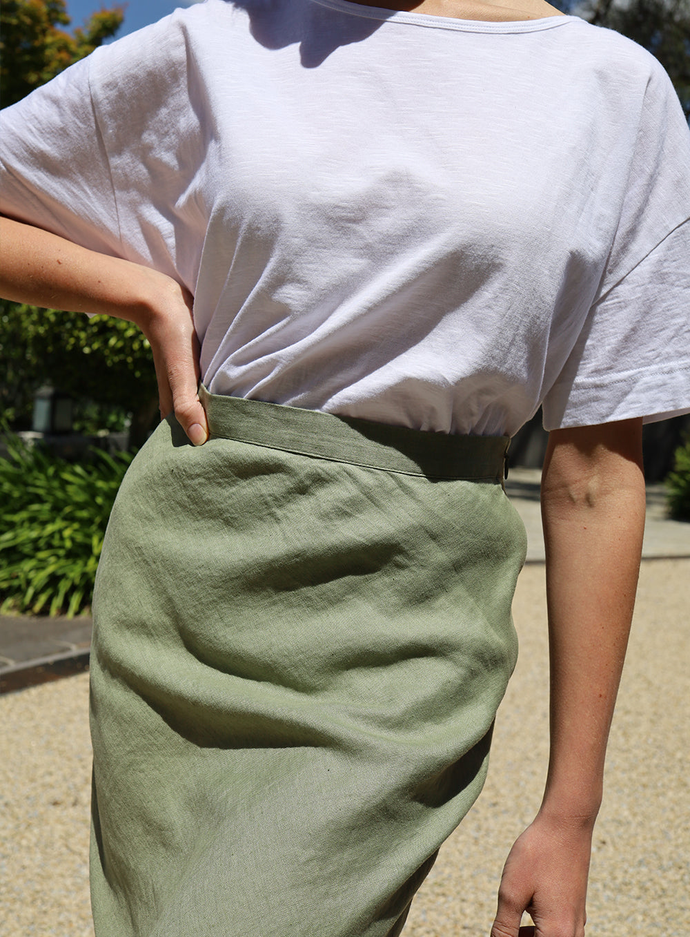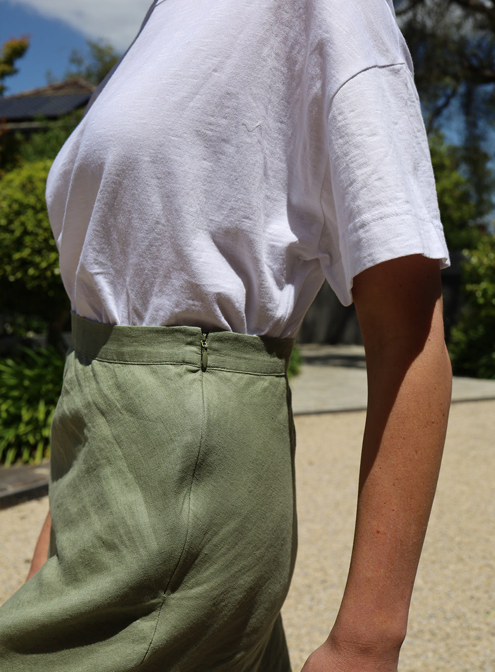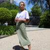 Midi Length. High waist fit. Zip closure in side. Constructed in luxe breathable 100% Linen.