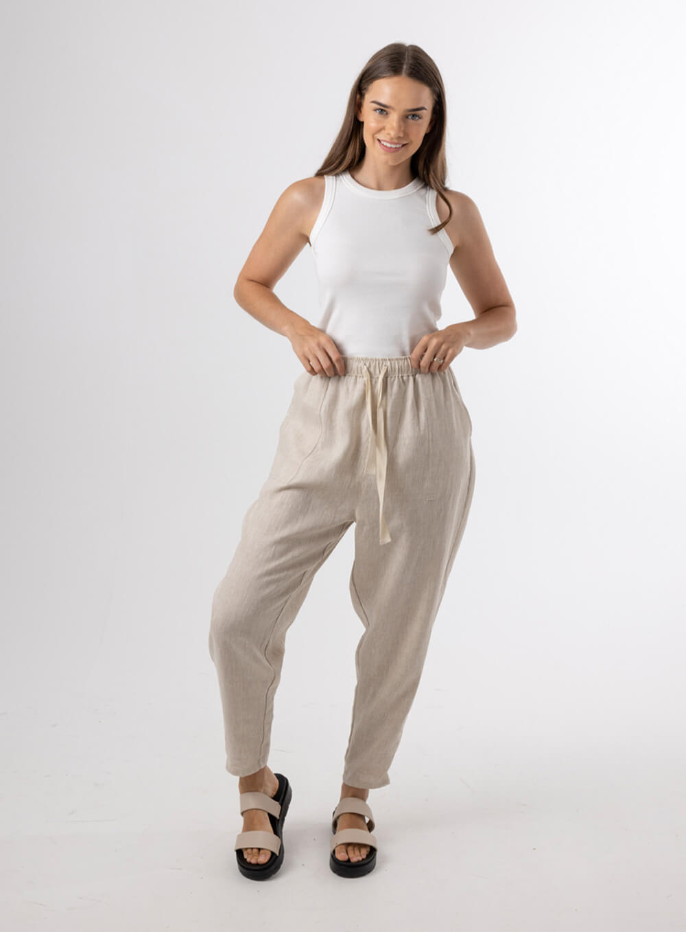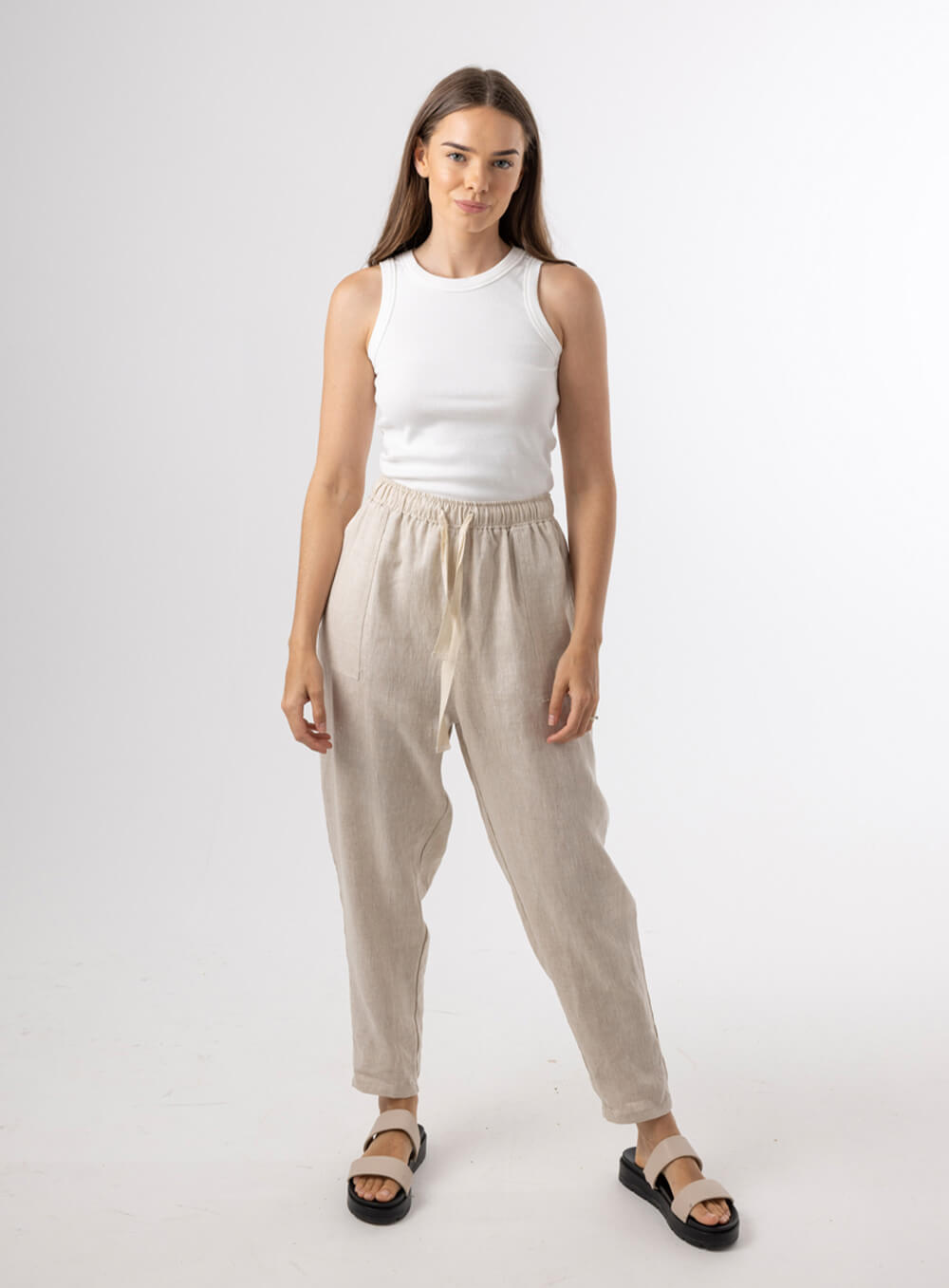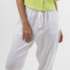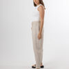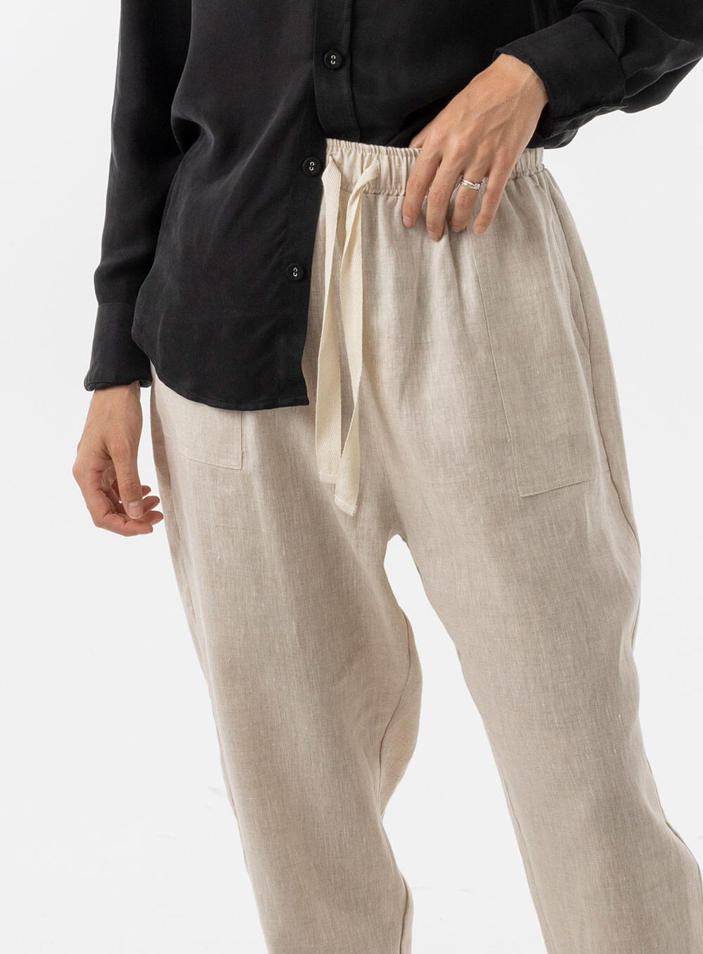 Functional tie and elastic waist. Slight Drop Crotch. Square pockets and tapered leg. Created in soft breathable 100% Linen.