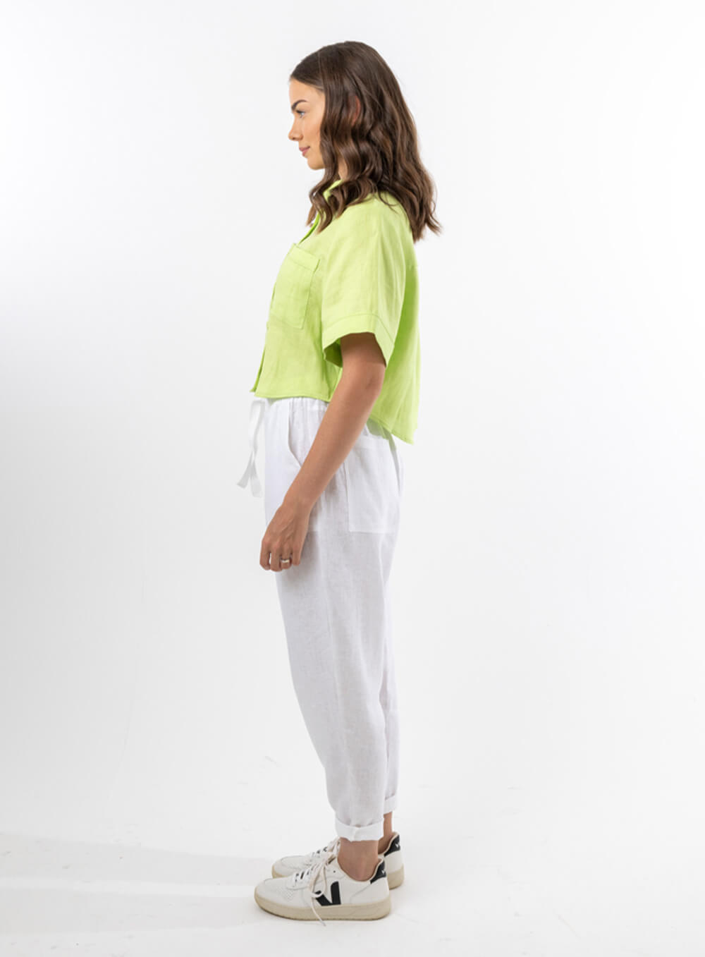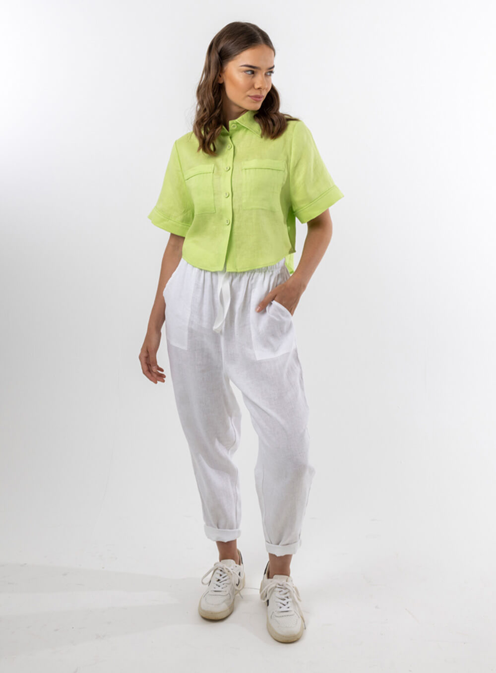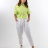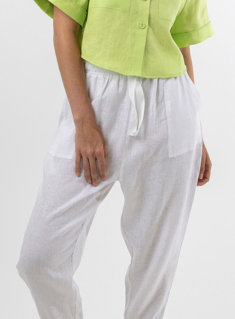 Functional tie and elastic waist. Slight Drop Crotch. Square pockets and tapered leg. Created in soft breathable 100% Linen.